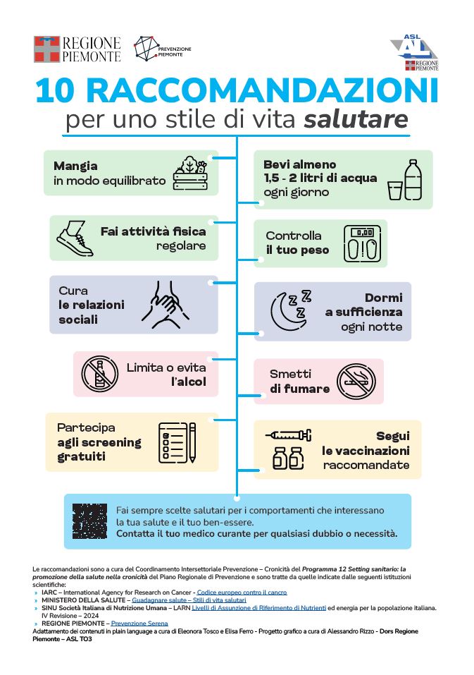 In questo quadro si collocano le 10 raccomandazioni per uno stile di vita salutare, definite nell’ambito del Piano Regionale di Prevenzione (PRP) 2020–2025 e basate su solide evidenze scientifiche. Le raccomandazioni rappresentano uno strumento informativo pensato per accompagnare cittadini e pazienti verso scelte consapevoli, anche in fase di dimissione ospedaliera.