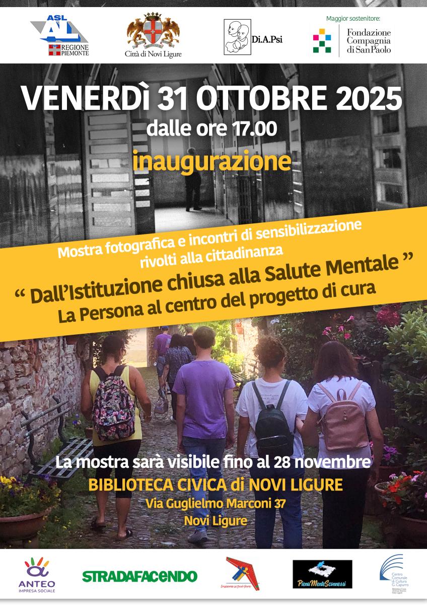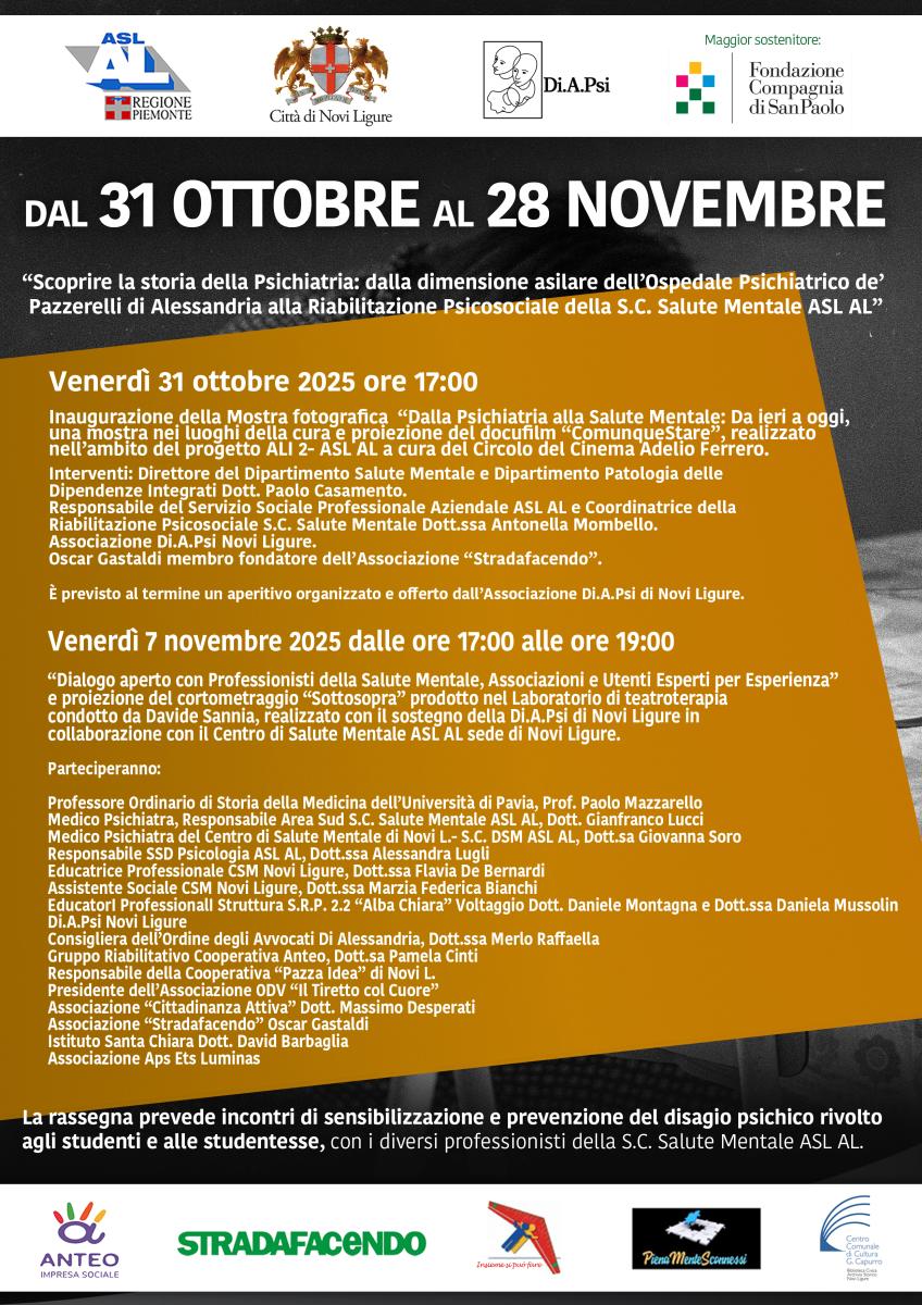 La S.C. Salute Mentale ASL AL e il Servizio Sociale Professionale Aziendale in collaborazione con l’Associazione Di.A.Psi di Novi Ligure e il patrocinio del Comune di Novi Ligure, organizzano nel periodo ottobre/novembre 2025 una rassegna di quattro eventi volti a sensibilizzare la cittadinanza sui temi legati alla salute mentale con un focus sulla prevenzione, sulla cura e riabilitazione psicosociale.